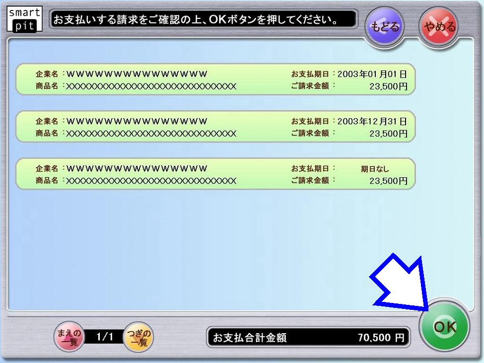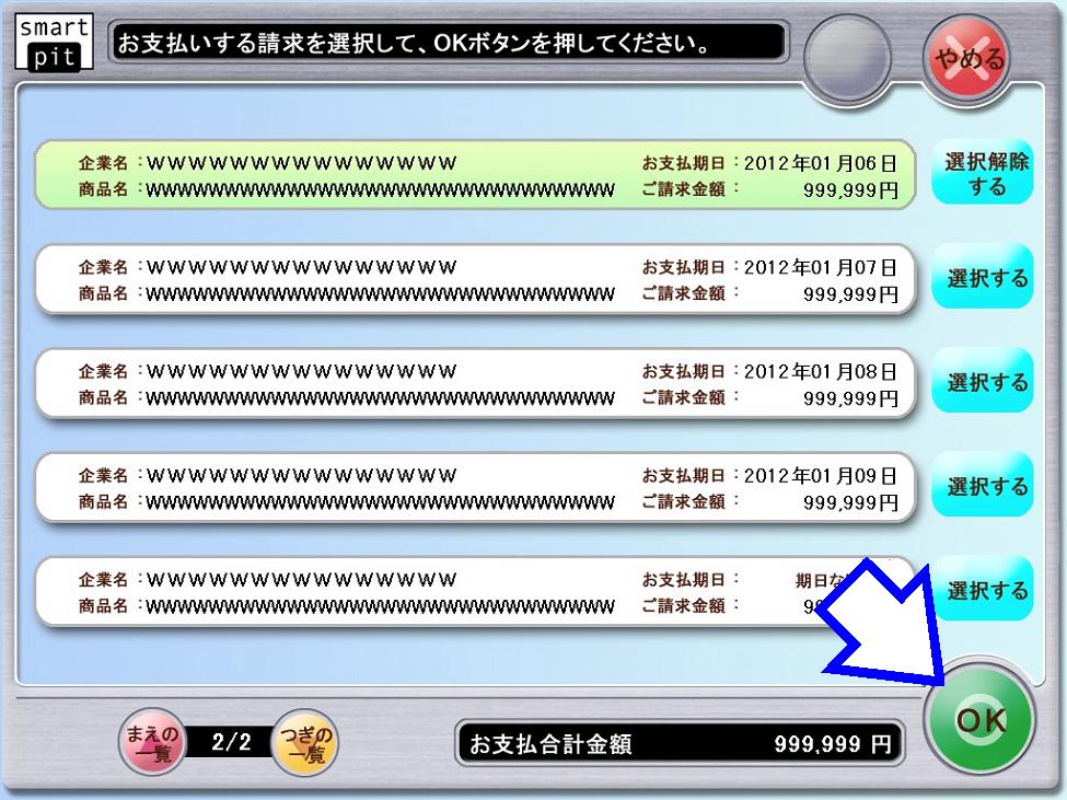お支払いする請求を選択して「OK」ボタンを押して下さい。 |